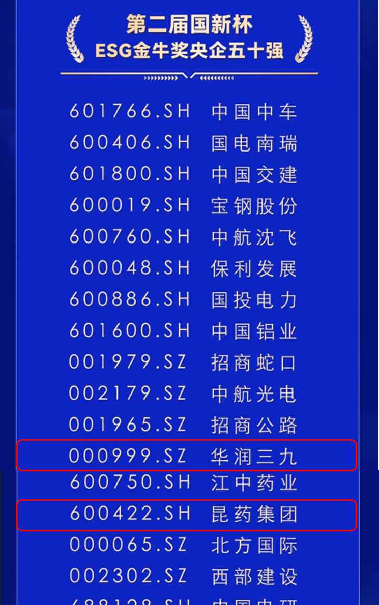 近日,由中国证券报与中国国新控股有限责任公司联合主办的2024金牛企业可持续发展论坛暨第二届国新杯·ESG金牛奖颁奖典礼在上海举行。会上,第二届国新杯·ESG金牛奖榜单揭晓,华润三九及旗下昆药集团均荣获“ESG金牛奖百强”及“ESG金牛奖央企五十强”。