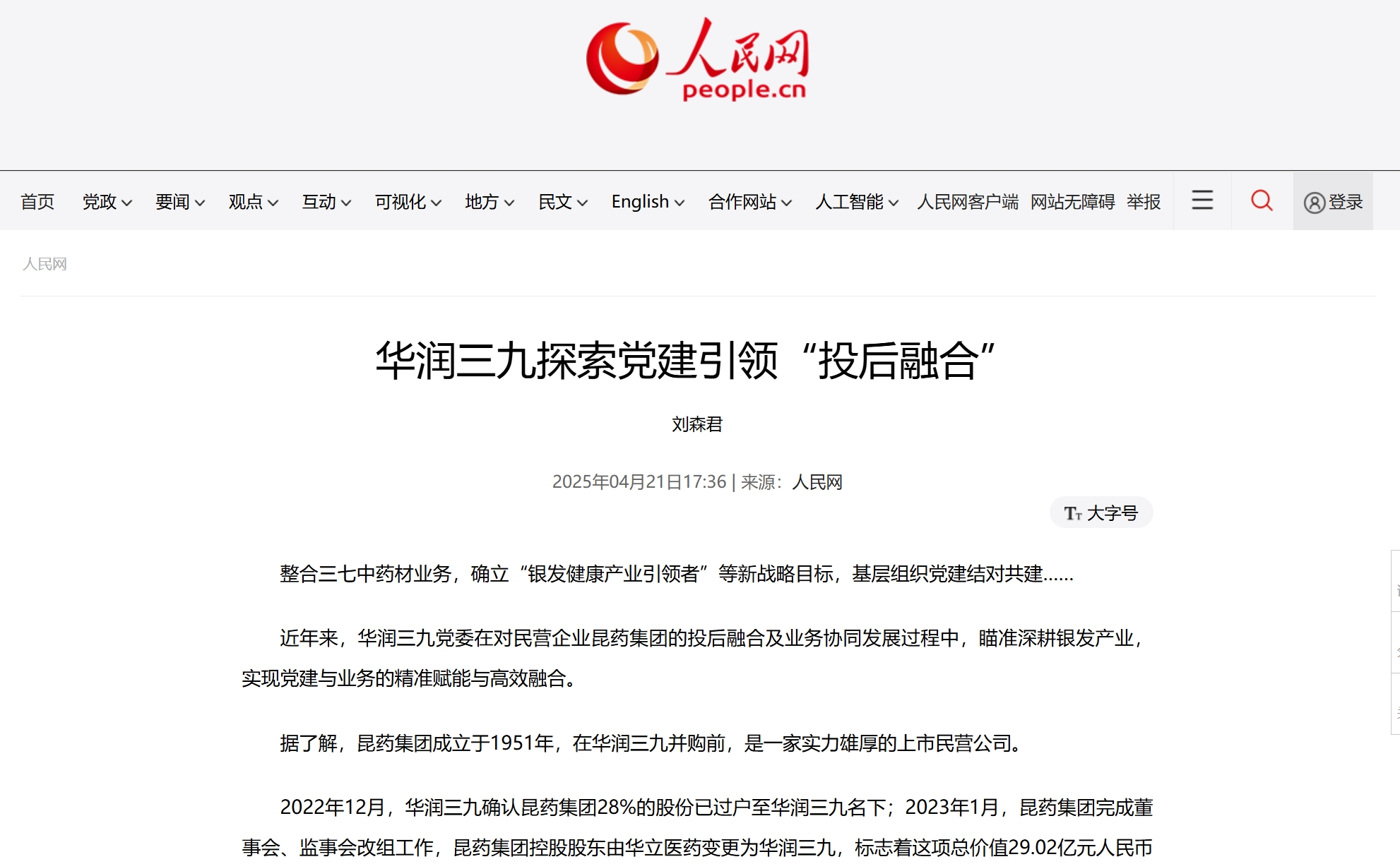人民网报道华润三九探索党建引领“投后融合”的实践