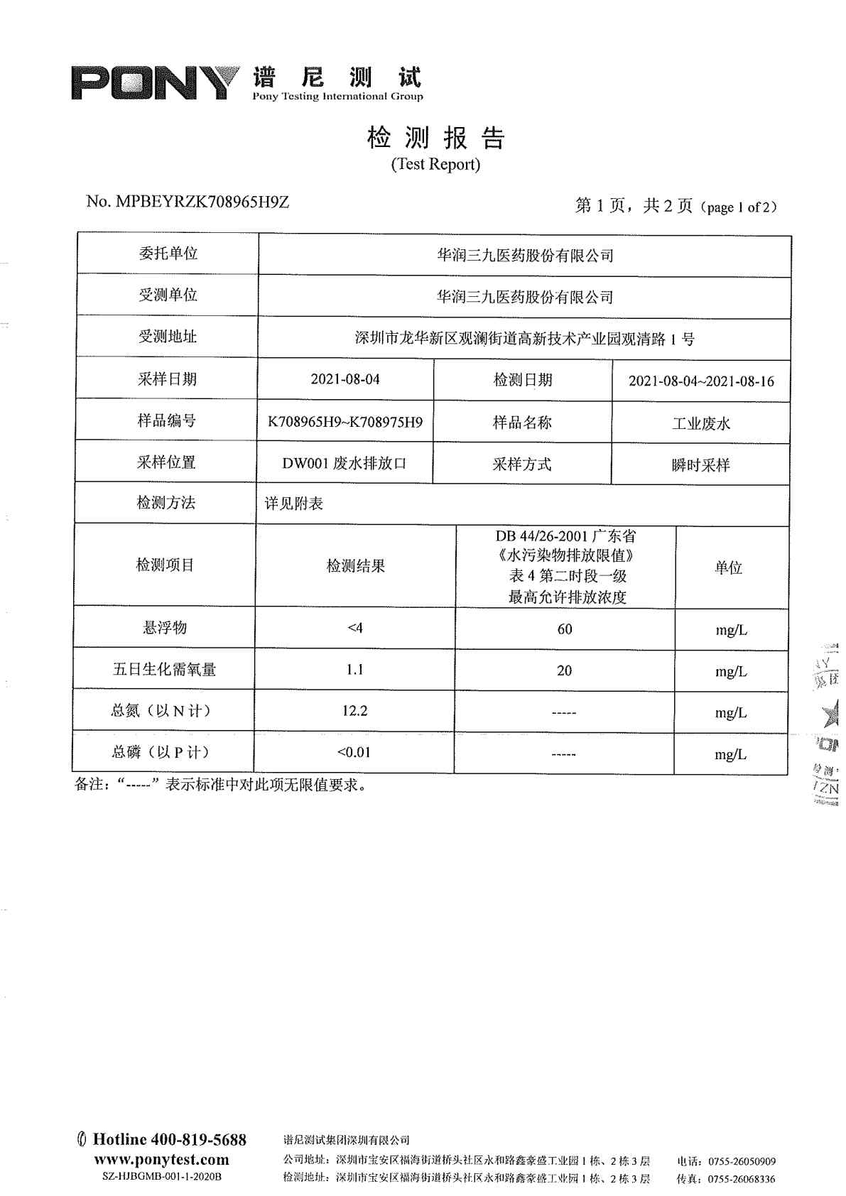 华润三九废水检测报告(2021年8月)