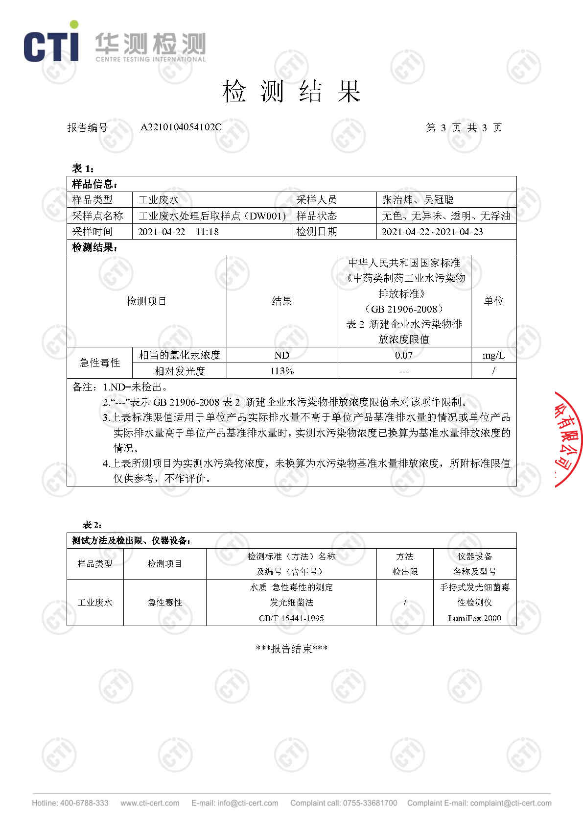 华润三九废水检测报告(2021年4月毒性)
