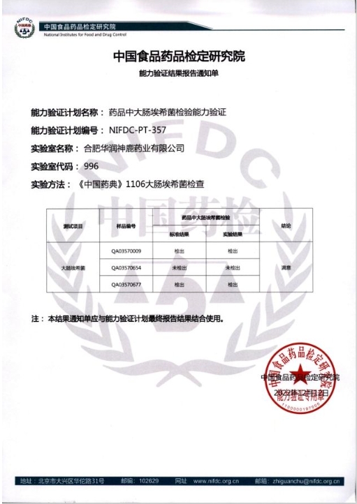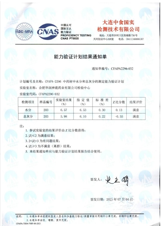 近日,在中国食品药品检定研究院公布的2023年的能力验证计划报告中,华润神鹿检验中心参加的“药品中霉菌和酵母菌总数计数能力验证(NIFDC-PT-446)”及“药品的比旋度测定能力验证(NIFDC-PT-406)”分别荣获满意证书。大连中食国实检测技术有限公司公布的2023年的能力验证计划报告中,华润神鹿检验中心参加的“中药材中水分和总灰分的测定能力验证(CFAJPA-2296)”同样荣获满意证书。上述四项满意证书的获得,标志着2023年华润神鹿检验中心参加上述能力验证项目全部通过,并连续5年通过能力验证。